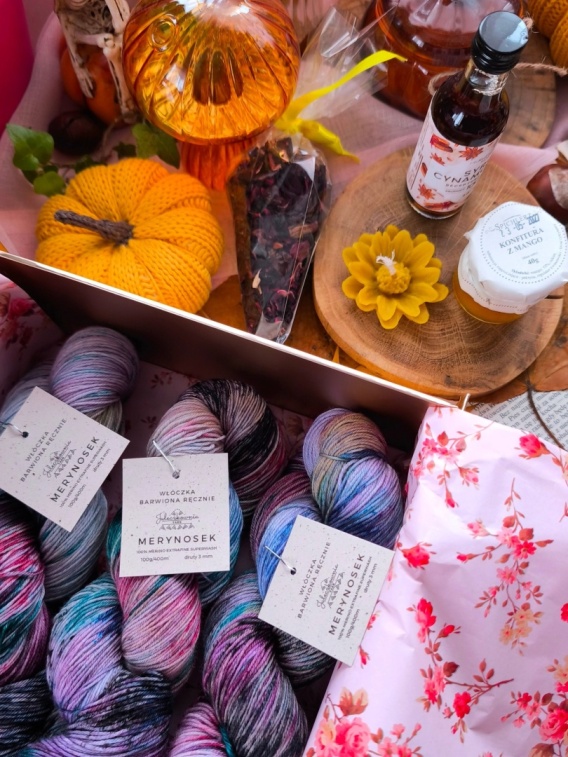 W zestawie znajdują się 3 motki włóczki MERYNOSEK, a do tego herbatka, dżemik, świeczka z wosku pszczelego oraz syrop do herbaty – wszystkie dodatki dobierane są losowo, tak by każdy zestaw był niepowtarzalny. Całość zapakowana jest w piękne pudełko zamykane magnetycznie, które samo w sobie jest małym prezentem.
