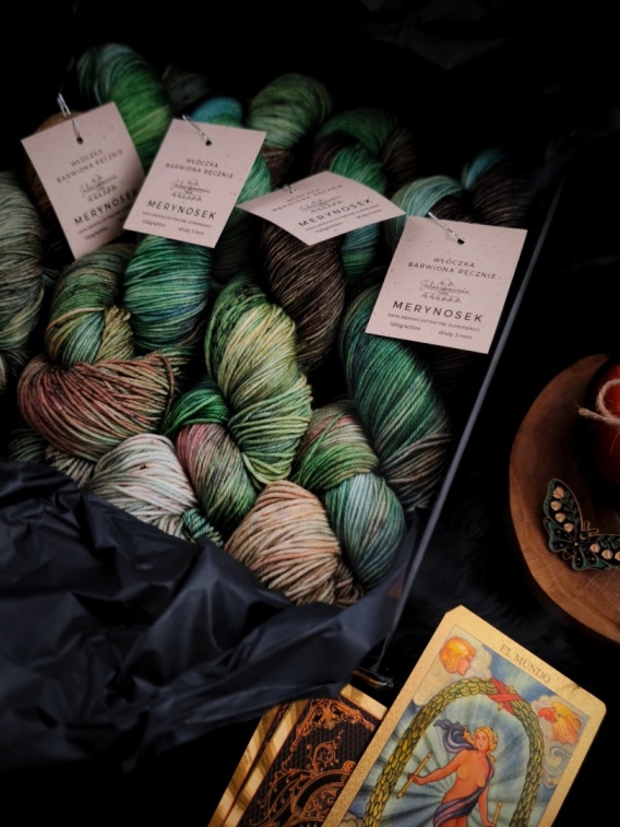 PUDEŁKO Z WŁÓCZKAMI - 4 motki wełny merino i magiczne bibeloty